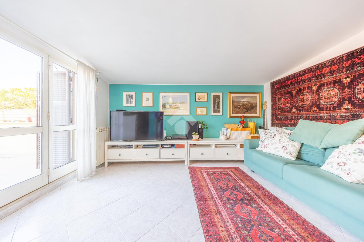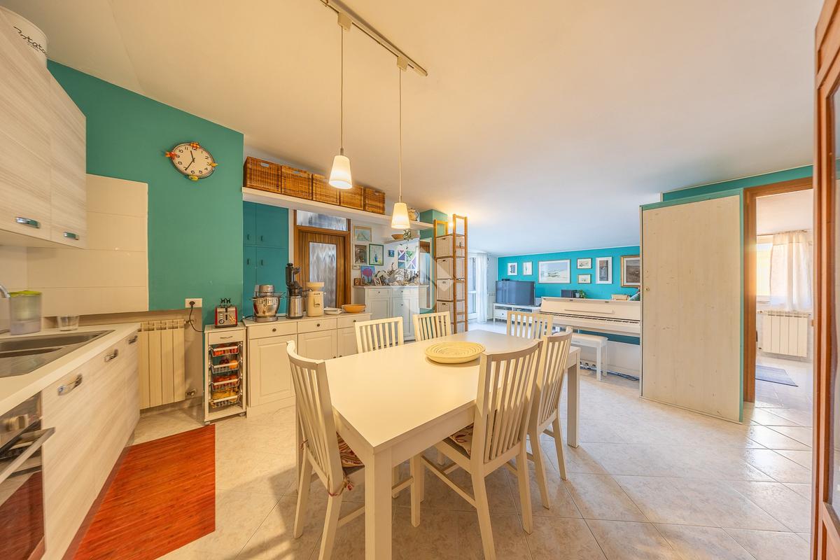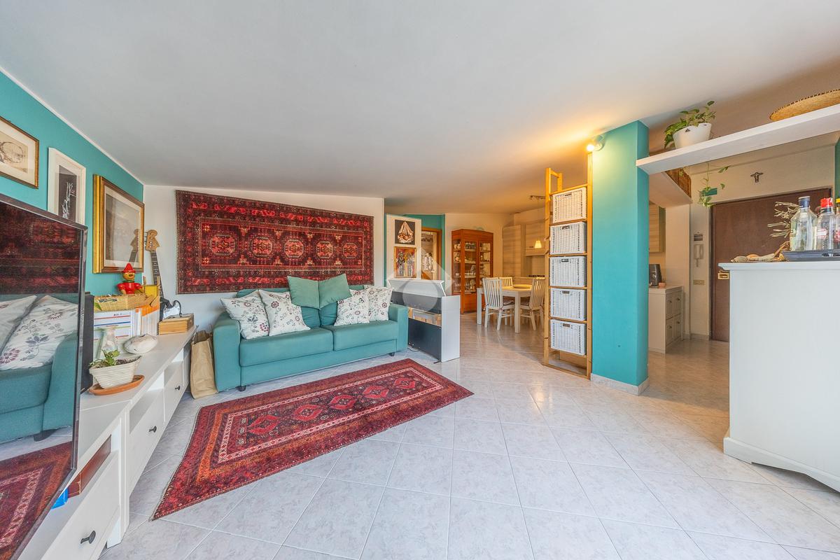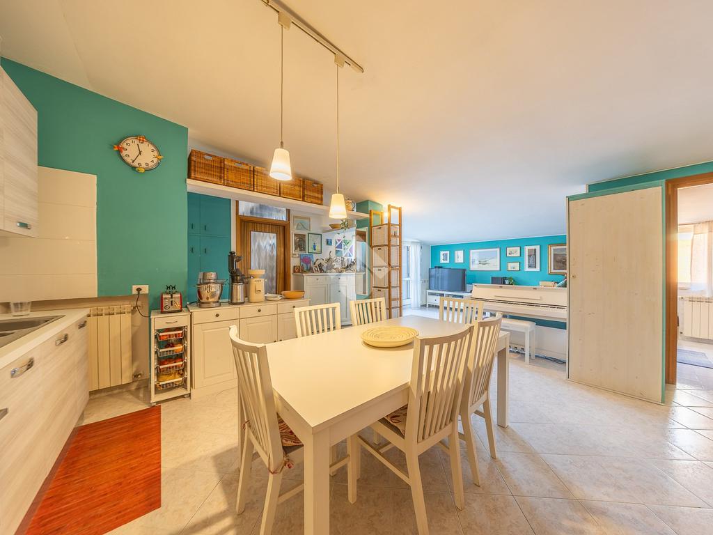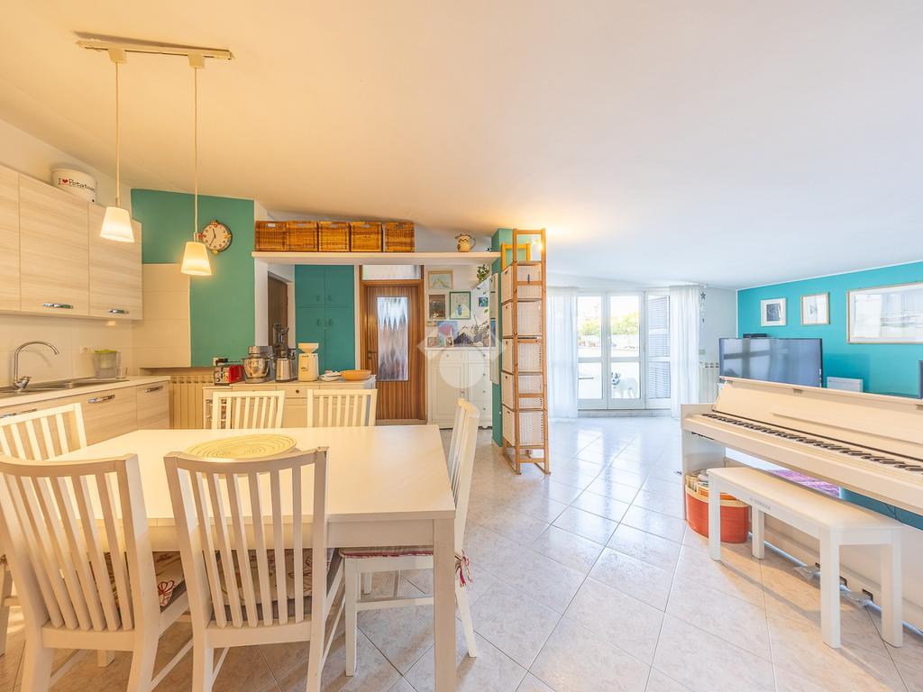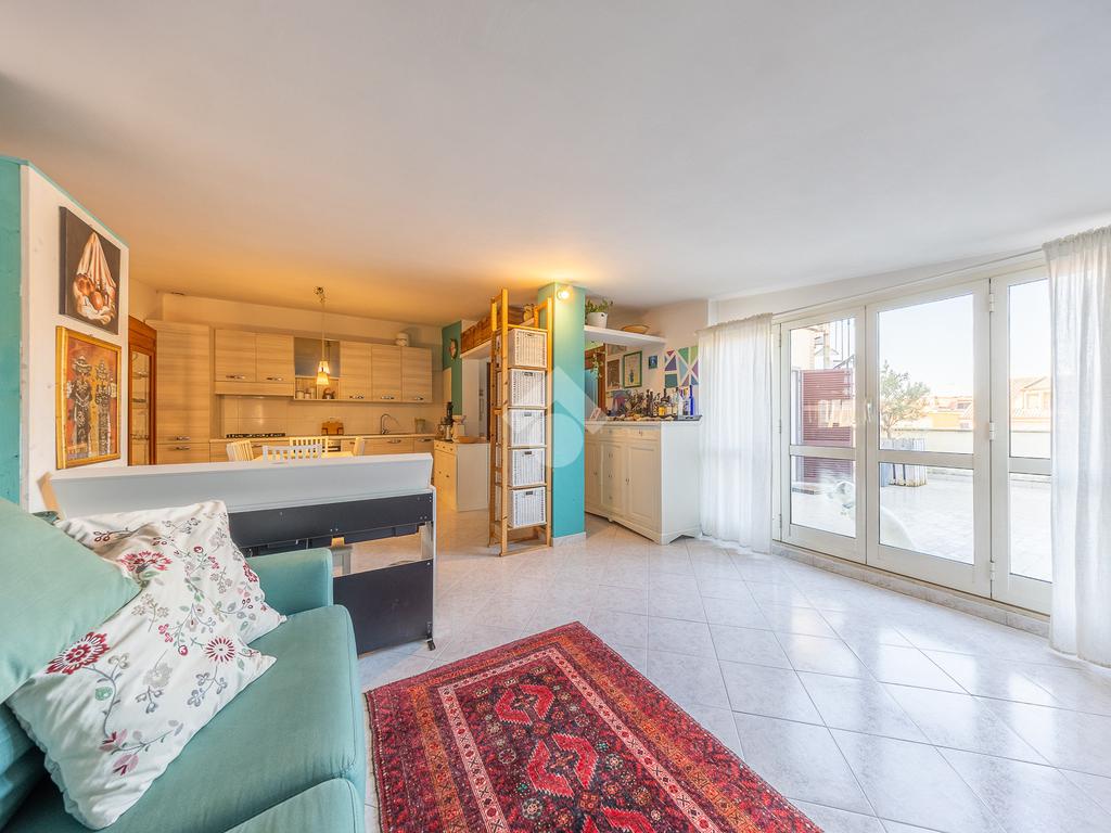 Situato al secondo piano di una palazzina in cortina, l’immobile si apre su un ampio e accogliente soggiorno con angolo cottura, cuore della casa, perfetto per vivere momenti di relax e convivialità. Da qui si accede a un comodo terrazzo vivibile, ideale per cene all’aperto o momenti di tranquillità. Una scala esterna conduce a un’ulteriore porzione di terrazzo rialzato.